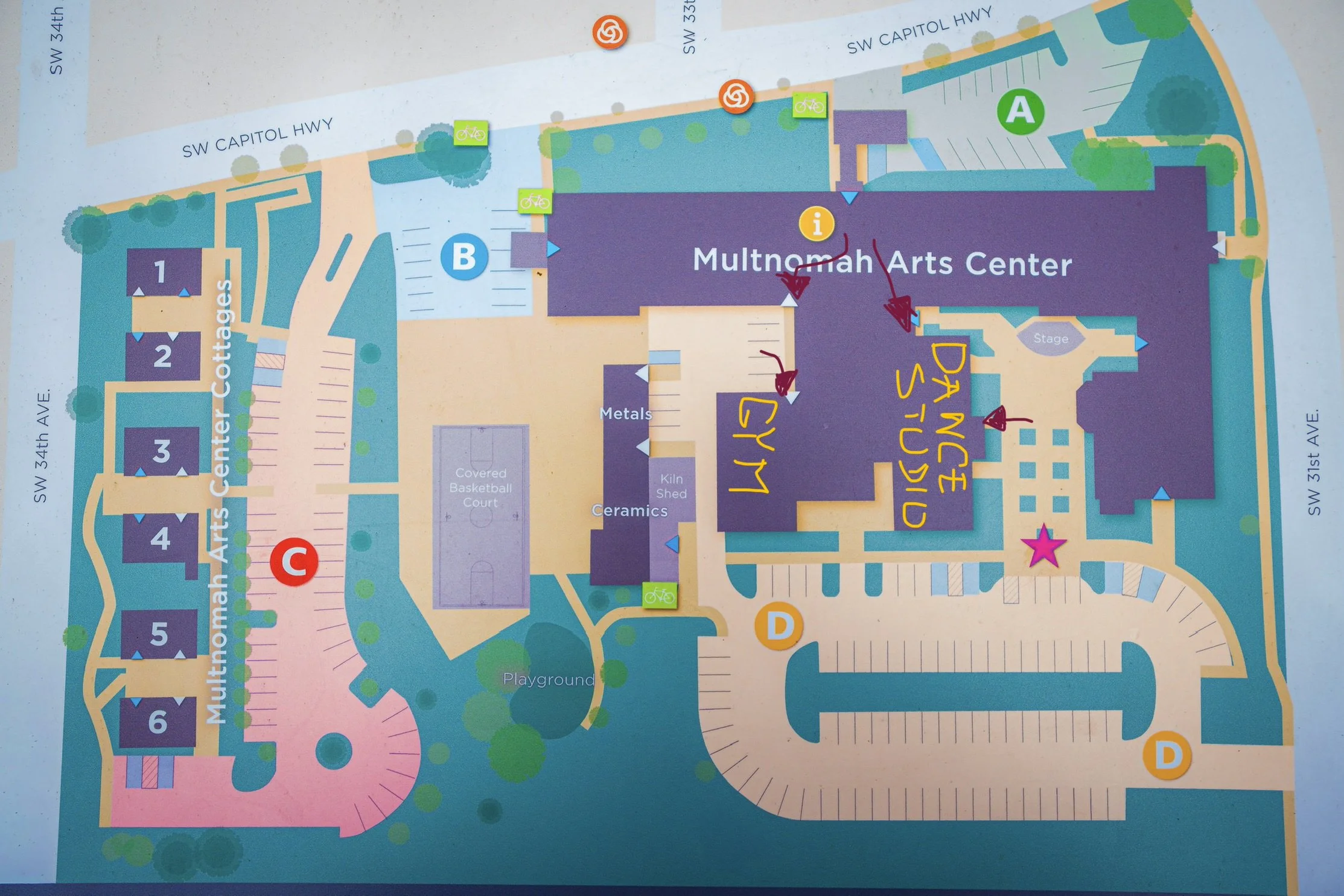 Multnomah Arts Center (MAC) parking lots A, B, & D are for MAC visitors Parking Only, and are free. You can enter the Gym or Dance Studio from Lot D.
